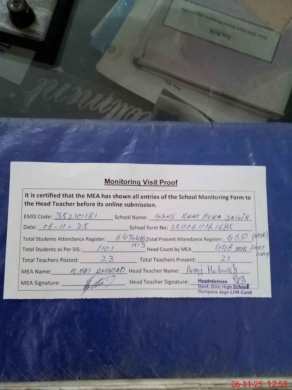 | Remarks (Use Separate Page if Required): Four Class in 2nd shift CEO DEA LHR last visit is on 5 Nov 2025 Total present as per register 460 Total present after head count 446 Difference of present student 14 | |||||