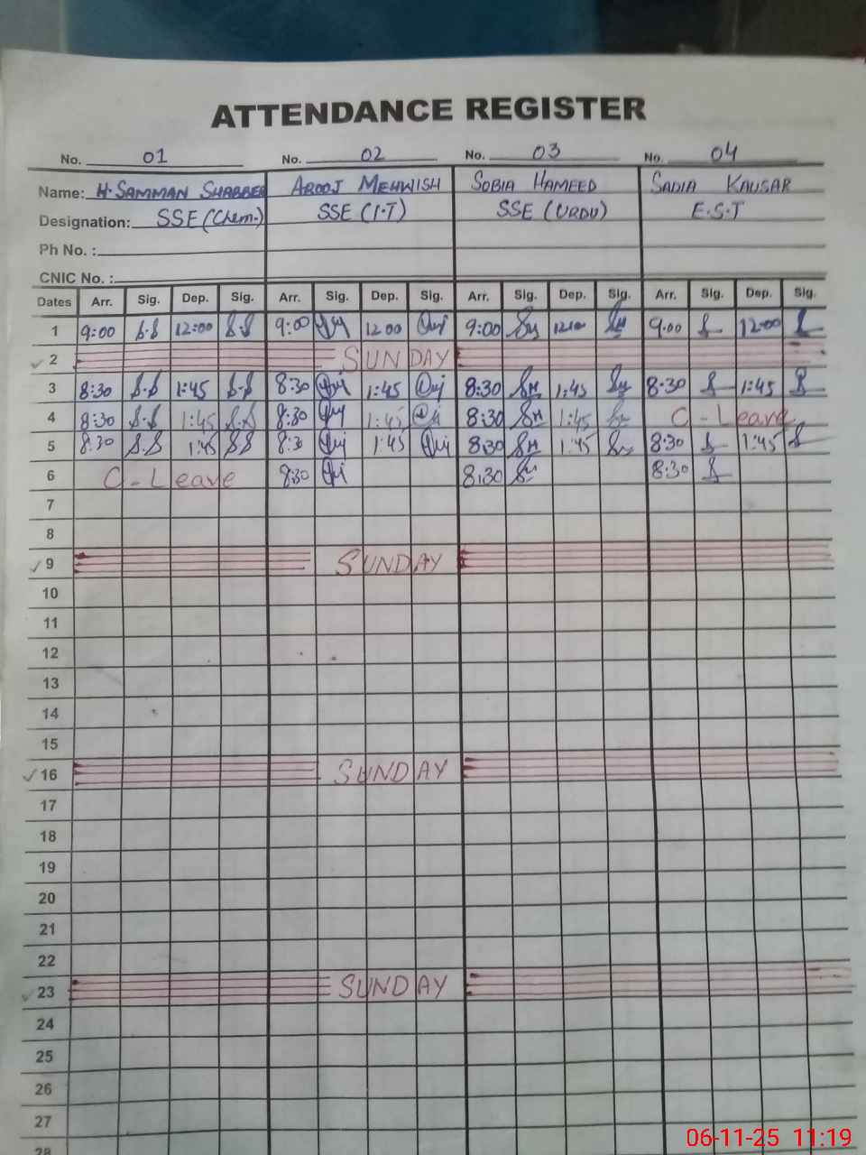 | CNIC | Full Name | Designation | R/C | Absence during last cal. month |