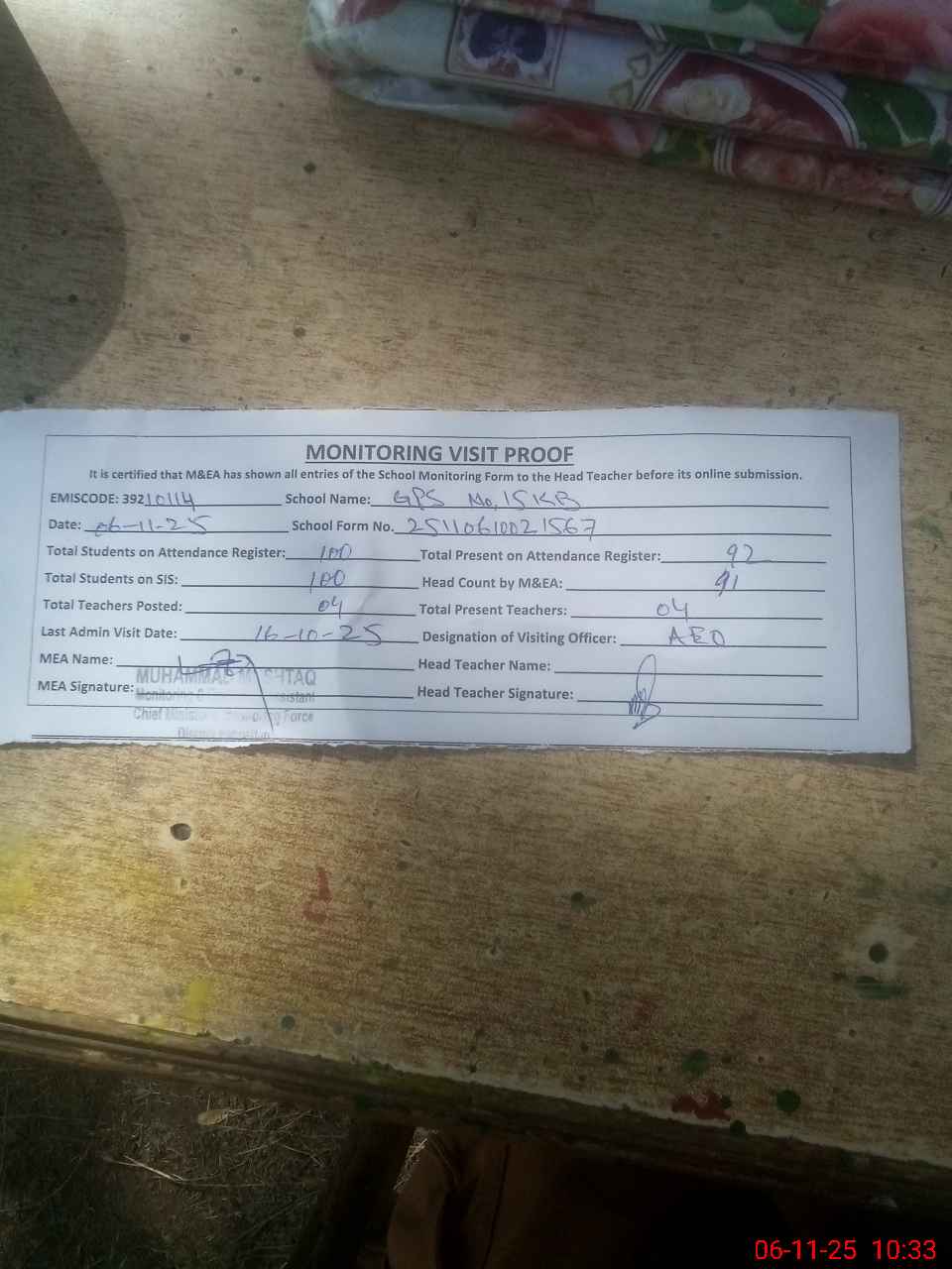 | EMIS Code: 39210114 | Name of School: GPS CHAK NO 15 KB | |||