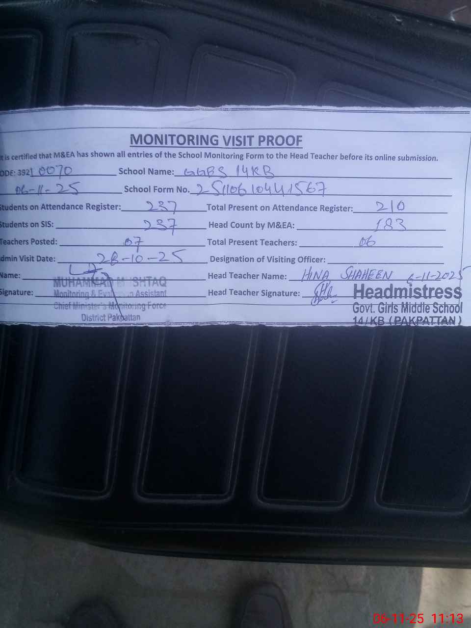 | EMIS Code: 39210070 | Name of School: GGES 14 KB PAKPATTAN | |||