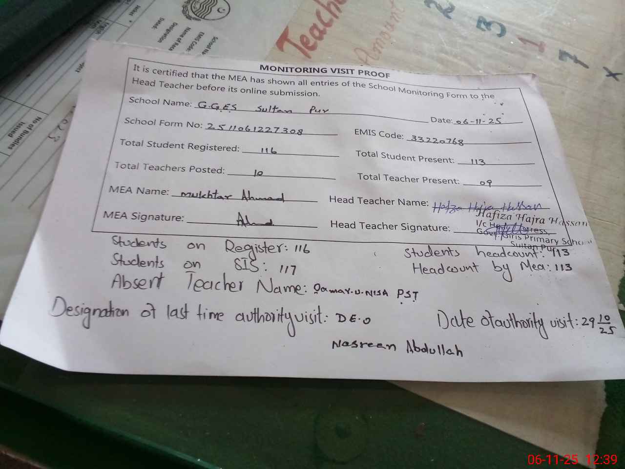 | Attendance Register | Head Teacher | MEA with School | Visit Proof |