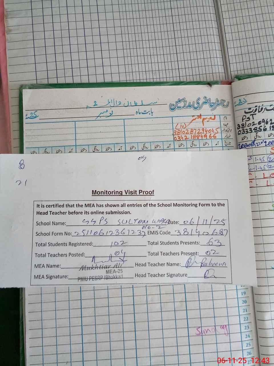 | Attendance Register | Head Teacher | MEA with School | Visit Proof |