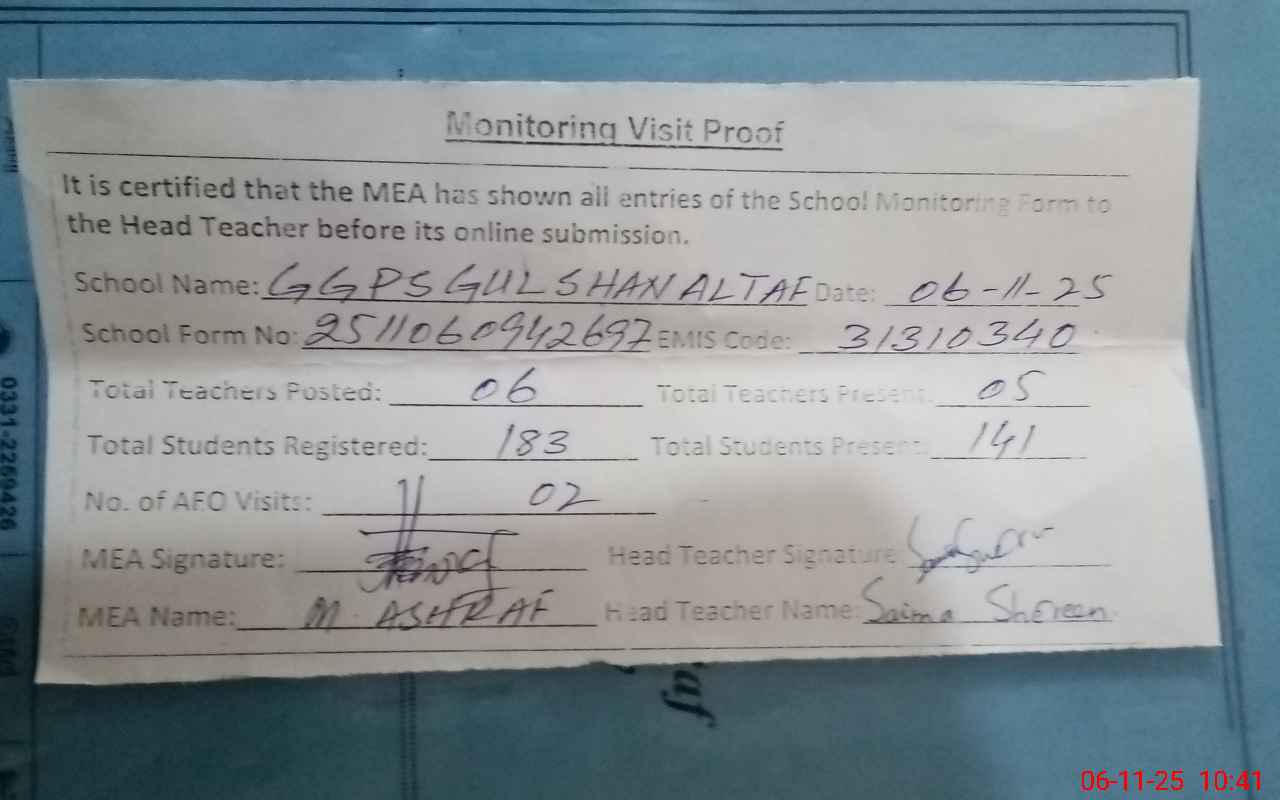 | EMIS Code: 31310340 | Name of School: GGPS GULSHAN ALTAF IRRIGATION COLONY | |||