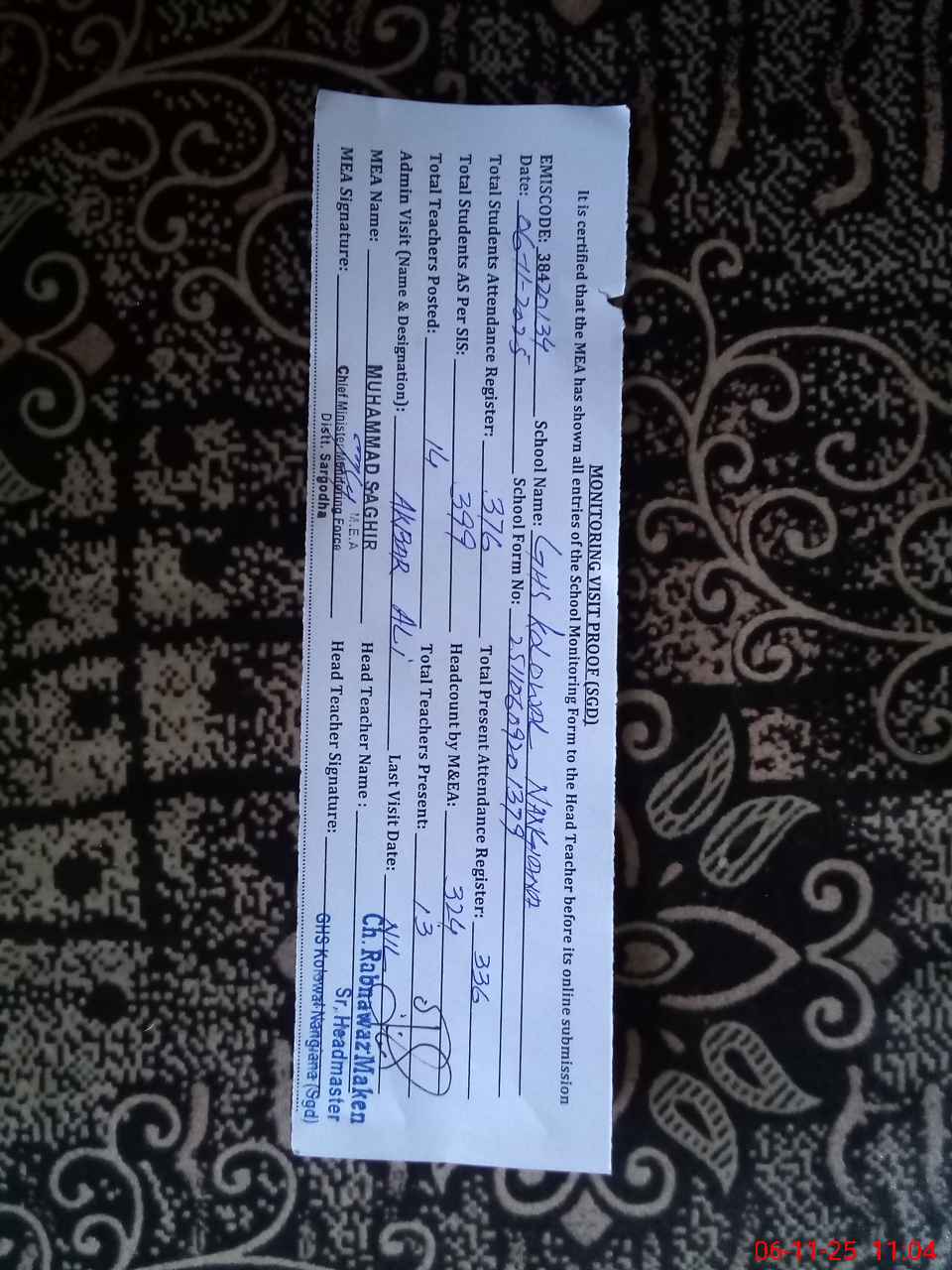 | Attendance Register | Head Teacher | MEA with School | Visit Proof |