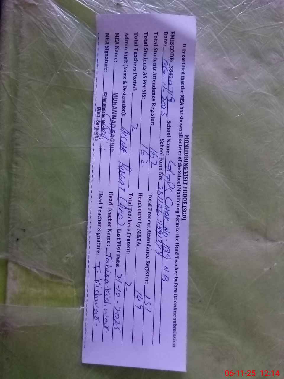 | Attendance Register | Head Teacher | MEA with School | Visit Proof |
