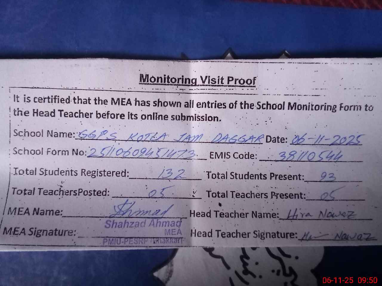 | Monitoring Date: 06-11-2025 | Start Time: 06-11-2025 09:27 AM | End Time: 06-11-2025 09:50 AM | Name of MEA: SH**** AH**** | |