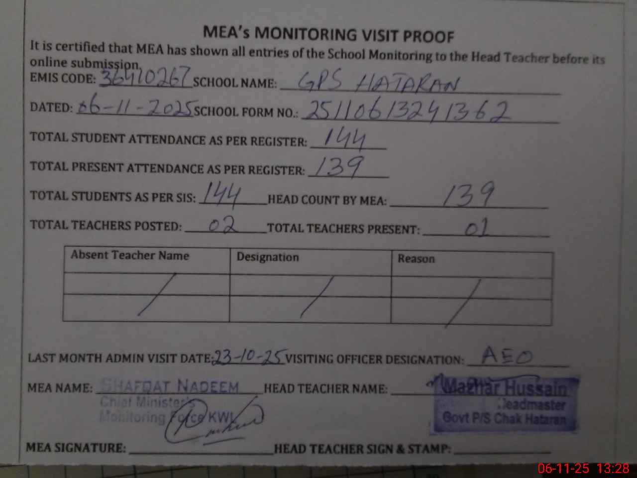 | Attendance Register | Head Teacher | MEA with School | Visit Proof |