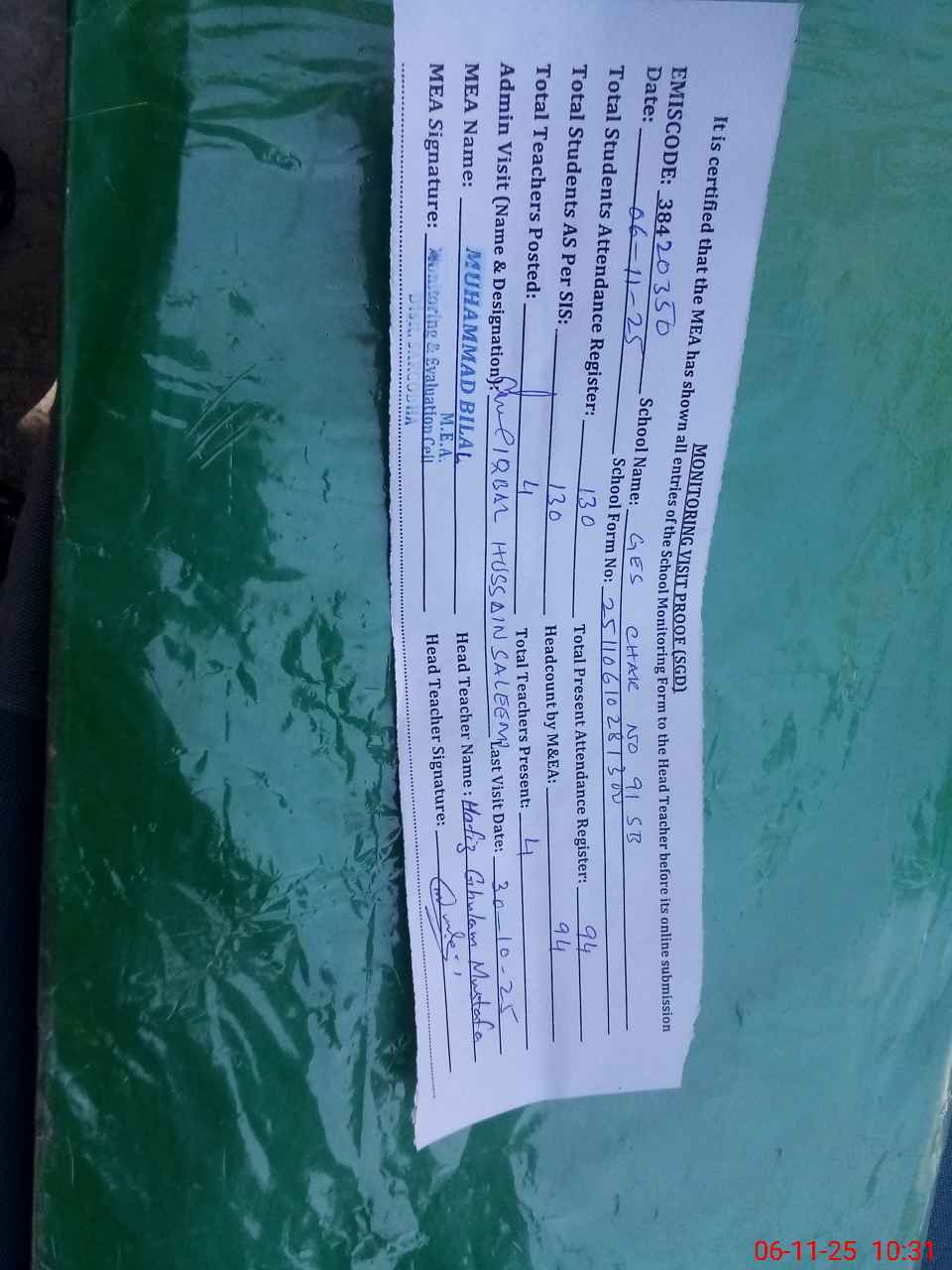 | Attendance Register | Head Teacher | MEA with School | Visit Proof |
