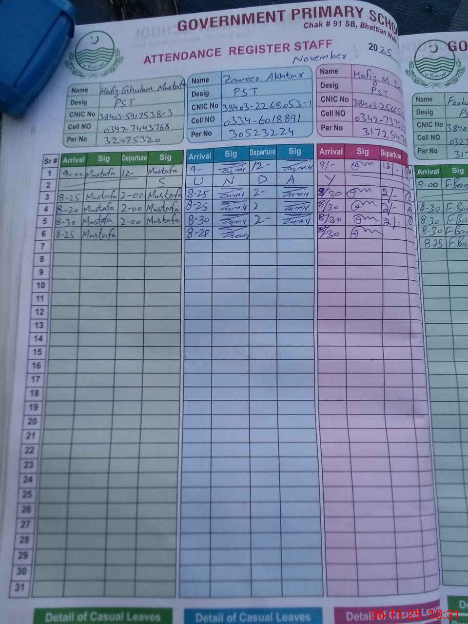 | CNIC | Full Name | Designation | R/C | Absence during last cal. month |