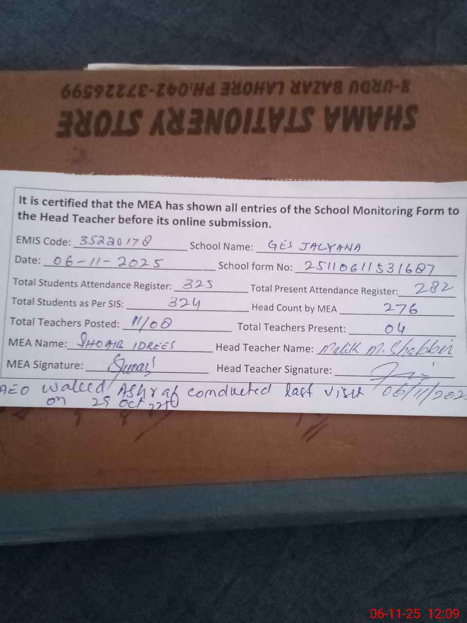 | Remarks (Use Separate Page if Required): 1 The following teachers are absent w e f dates mentioned against each Madiha Mushtaq PST 23 April 2025 Nazish Ambreen PST 08 Sep 2025 2 Muhammad Ilyas PST shown on BISE duty but written order was not a available so marked him absent 3 Ghulam Murtaza EST shown on survey duty but the written or soft order was not available so marked him absent 4 Two classrooms declared dangerous locally even one of them is still using for teaching 5 One toilet is non functional due to blockage 6 The razor wire partially damaged 7 The cleanliness standard of the classrooms toilets and laws were very poor 8 Furniture required for 90 students 9 AEO Waleed Ashraf conducted last visit on 29 October 2025 10 Muhammad Tabish Jawad has been removed from service since 06 March 2025 but his name still visible in the school teacher list | |||||