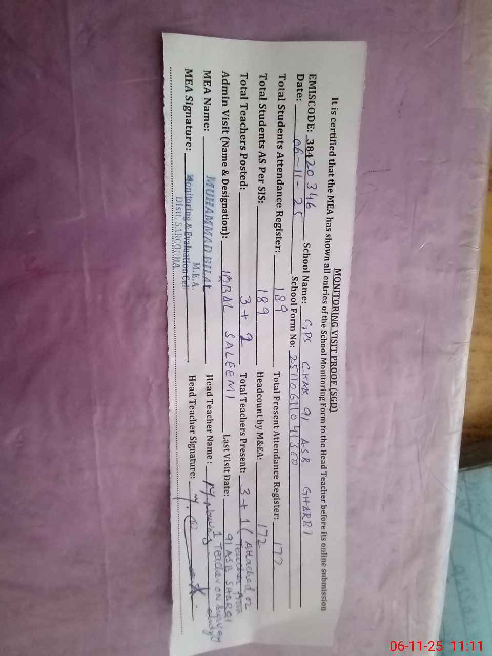 | Attendance Register | Head Teacher | MEA with School | Visit Proof |