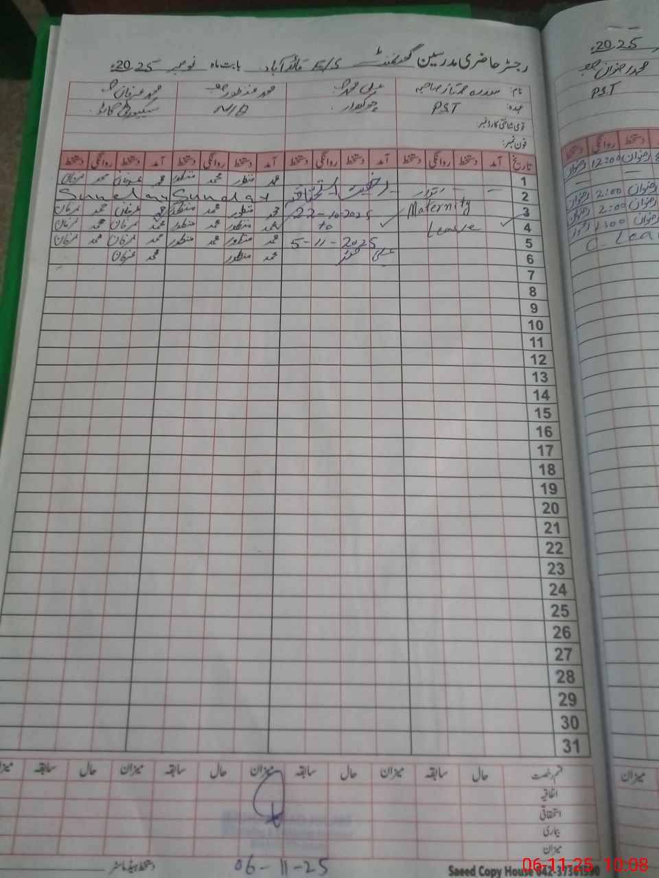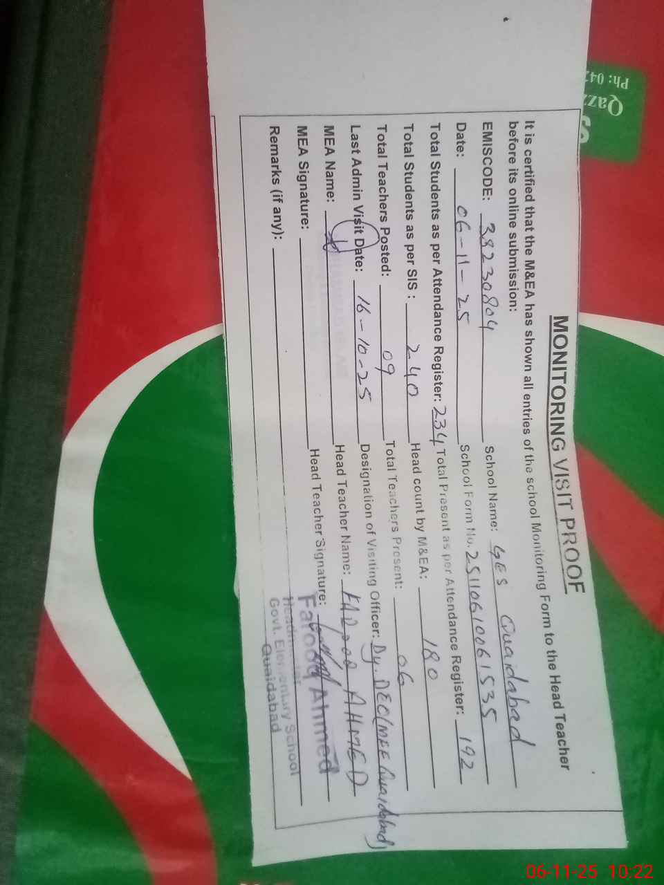 | Remarks (Use Separate Page if Required): Dy DEO visited school on 6 October 2025 Students strength on sis 240 Nosheen Mustaq p no 31597208 resigned from service dated 31 January 2025 but her name not deleted from sis | |||||