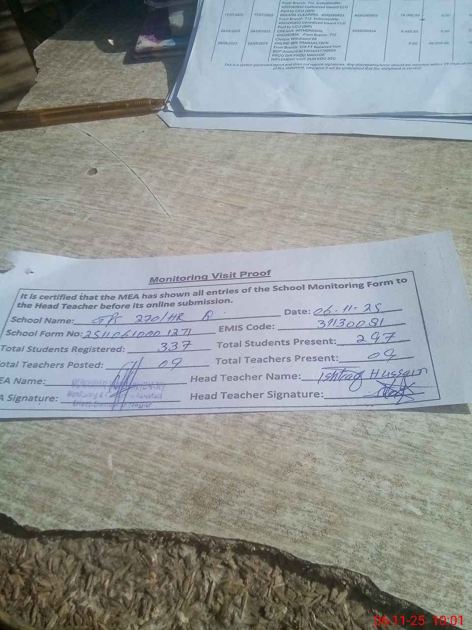 | Attendance Register | Head Teacher | MEA with School | Visit Proof |