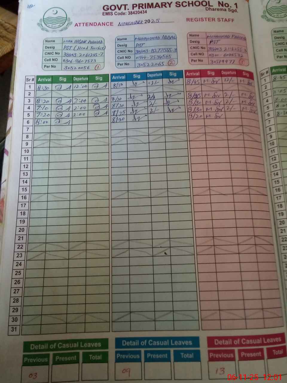 | CNIC | Full Name | Designation | R/C | Absence during last cal. month |