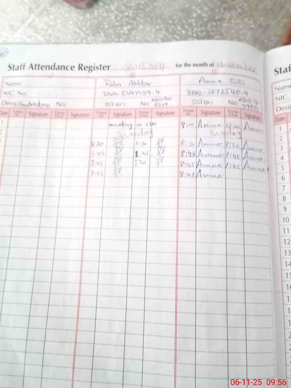| CNIC | Full Name | Designation | R/C | Absence During Last Calender Month |