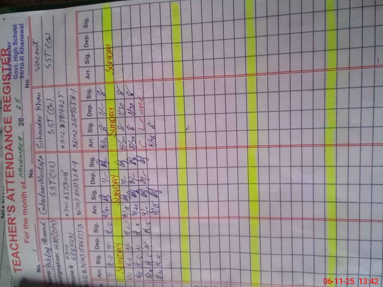 | CNIC | Full Name | Designation | R/C | Absence During Last Calender Month |