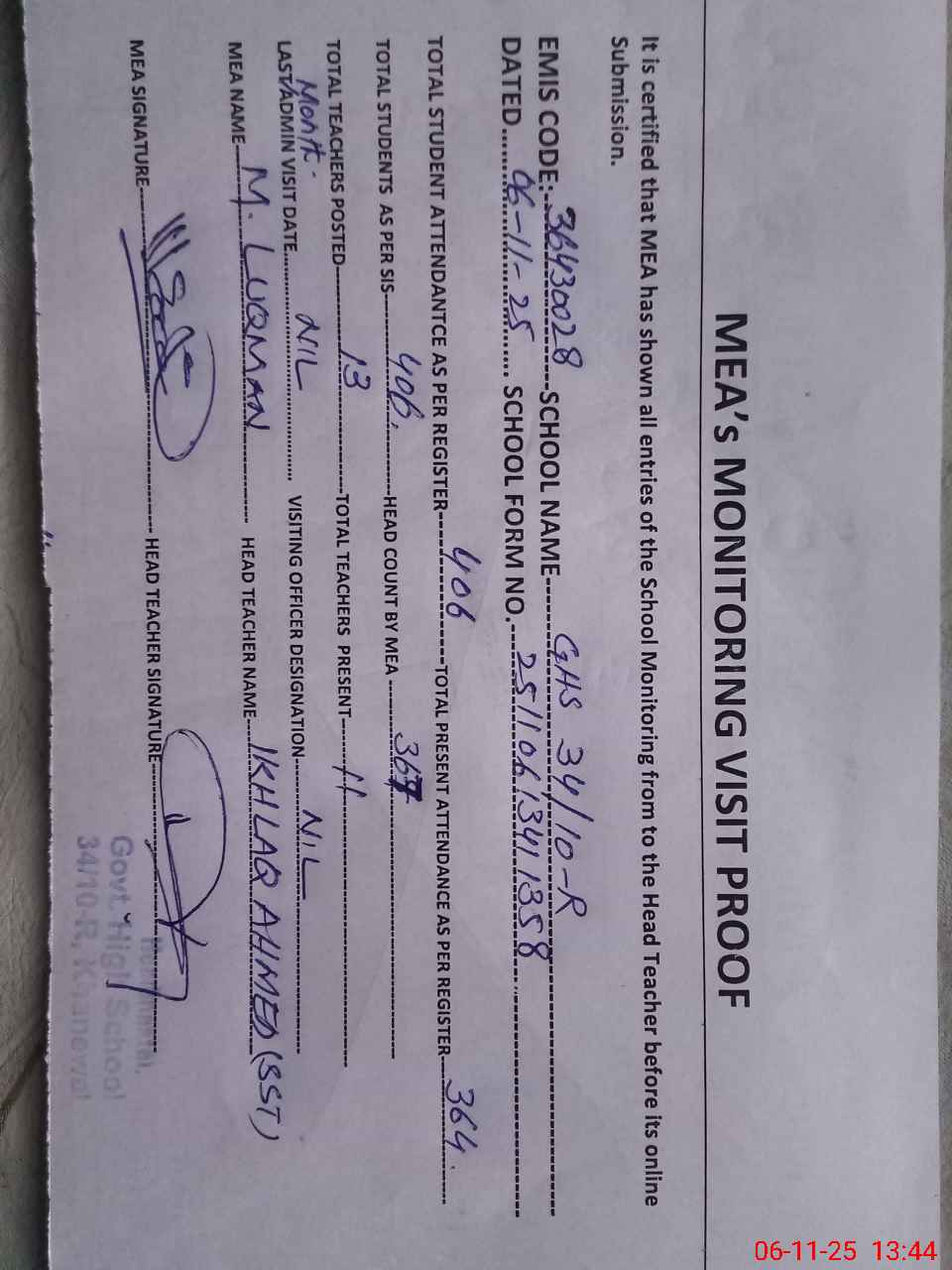 | Certified that this School was Inspected by the Undersigned MEA/DMO Today and the Information Stated Above is as Per Record. | |||||