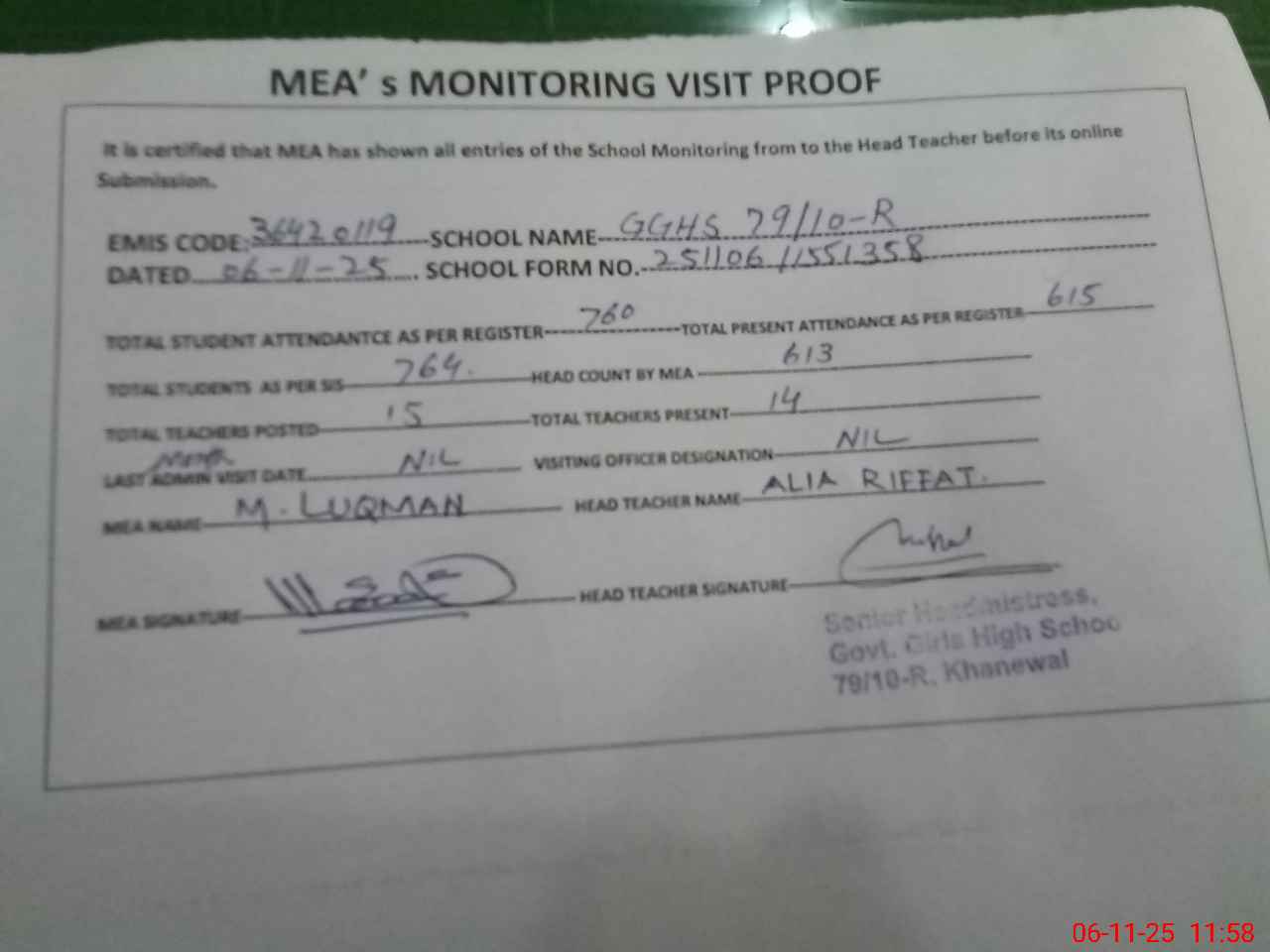 | Attendance Register | Head Teacher | MEA with School | Visit Proof |