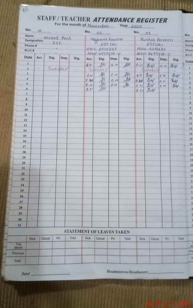 | Name: NA**** KO**** Designation: (School Headmaster's/Headmistress's) EST (GENERAL) Phone/Cell Number: 03**** |