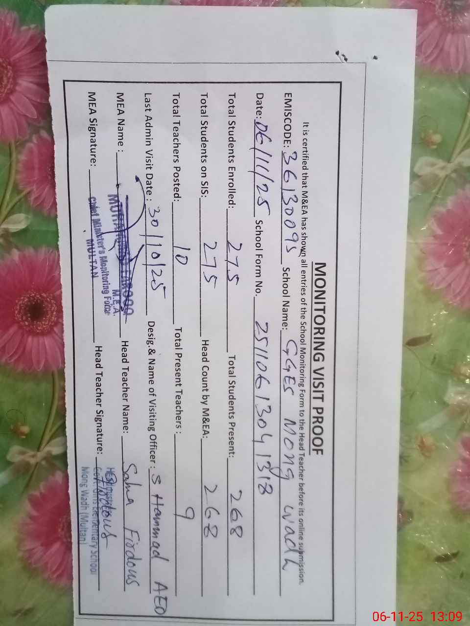 | Certified that this School was Inspected by the Undersigned MEA/DMO Today and the Information Stated Above is as Per Record. | |||||
