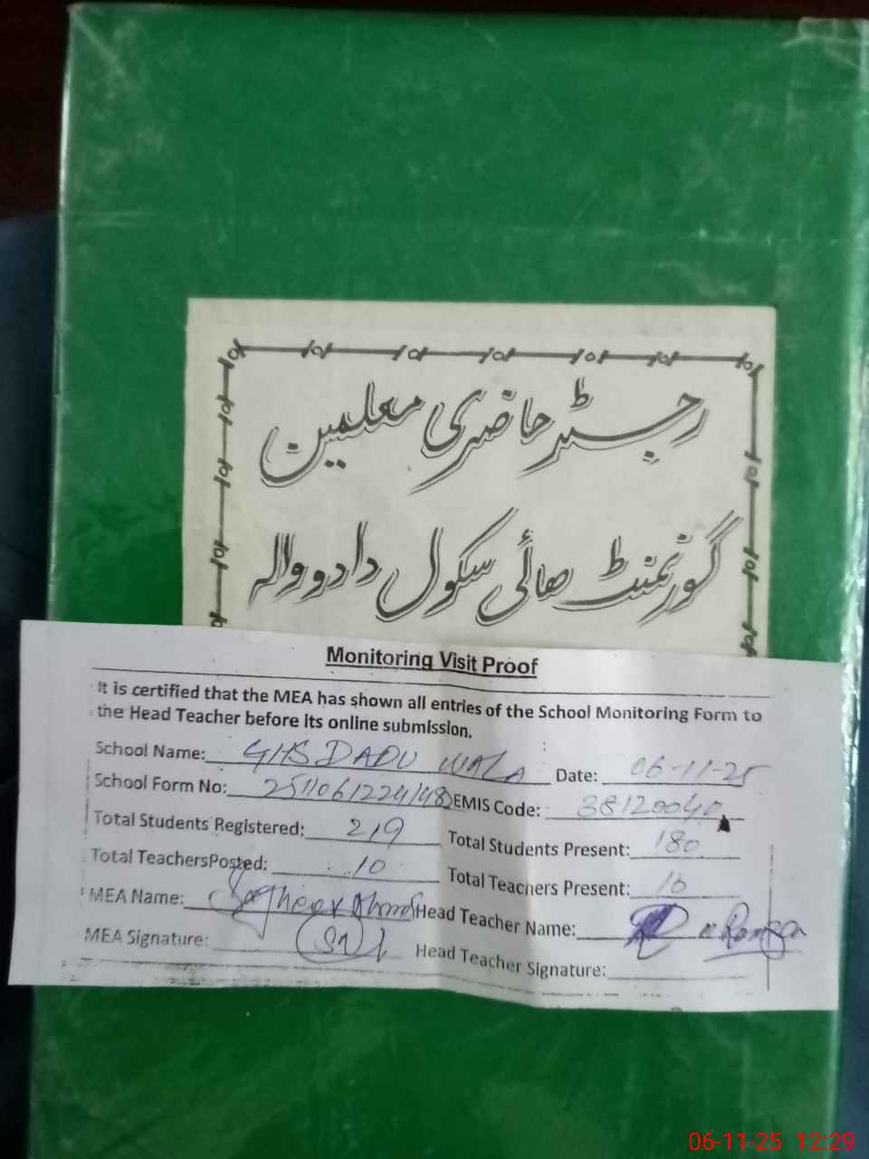 | Attendance Register | Head Teacher | MEA with School | Visit Proof |