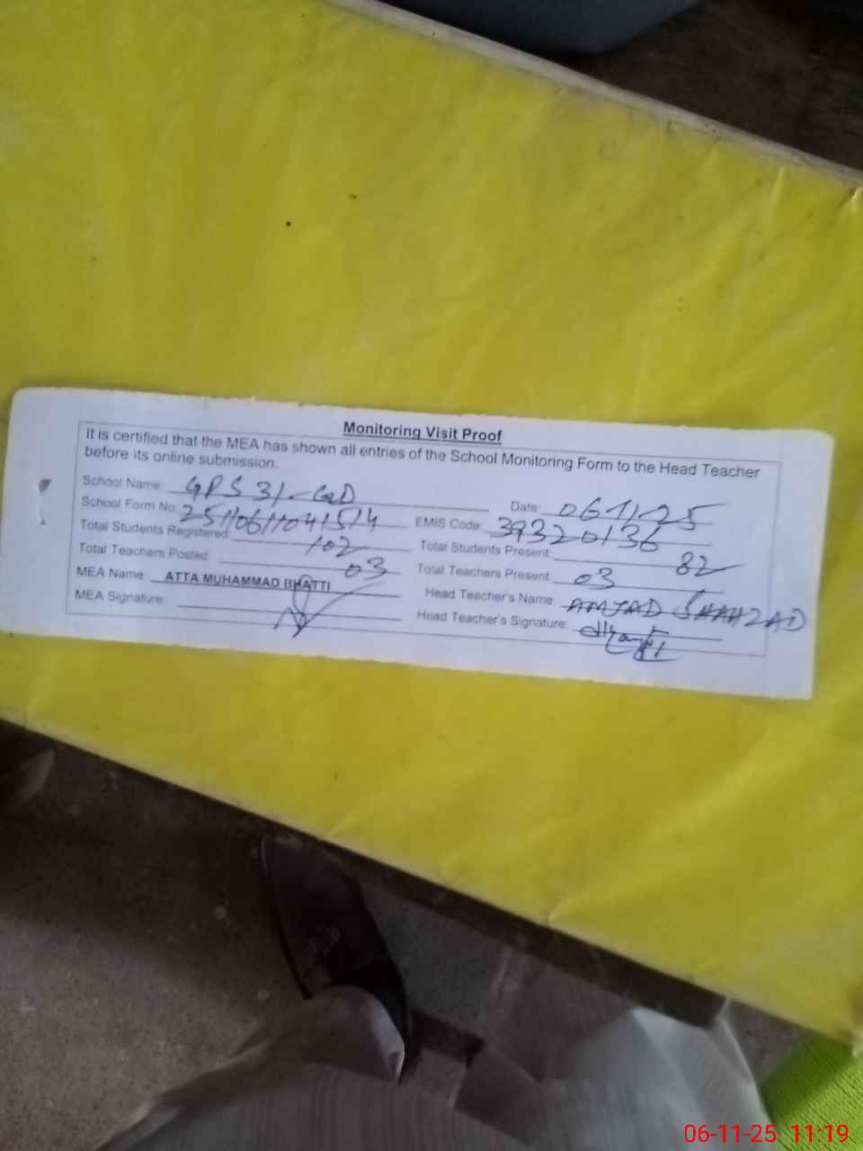 | Attendance Register | Head Teacher | MEA with School | Visit Proof |