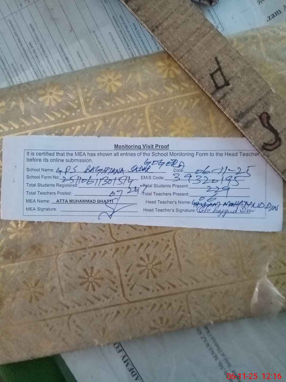 | Attendance Register | Head Teacher | MEA with School | Visit Proof |