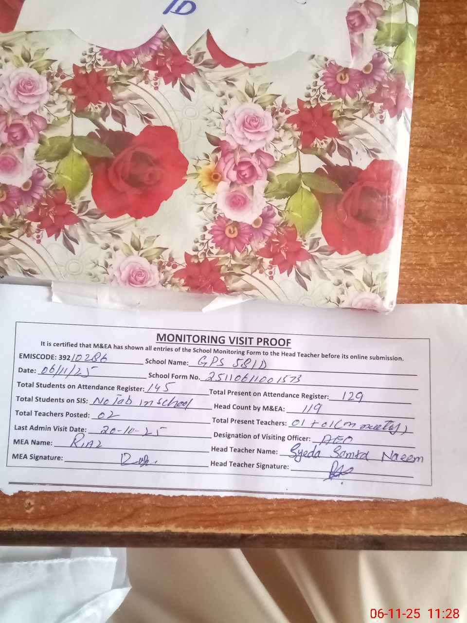 | Attendance Register | Head Teacher | MEA with School | Visit Proof |