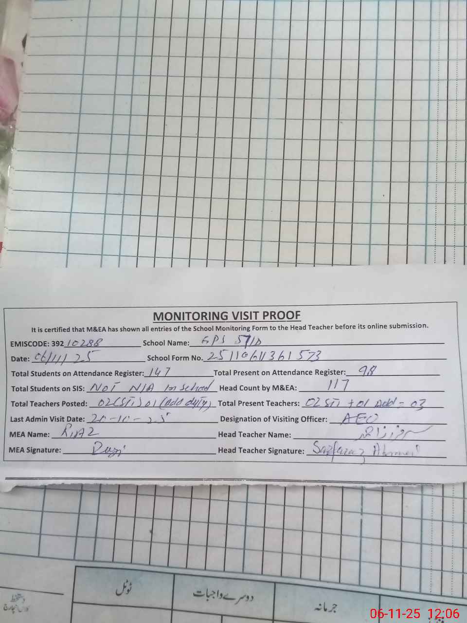 | Attendance Register | Head Teacher | MEA with School | Visit Proof |