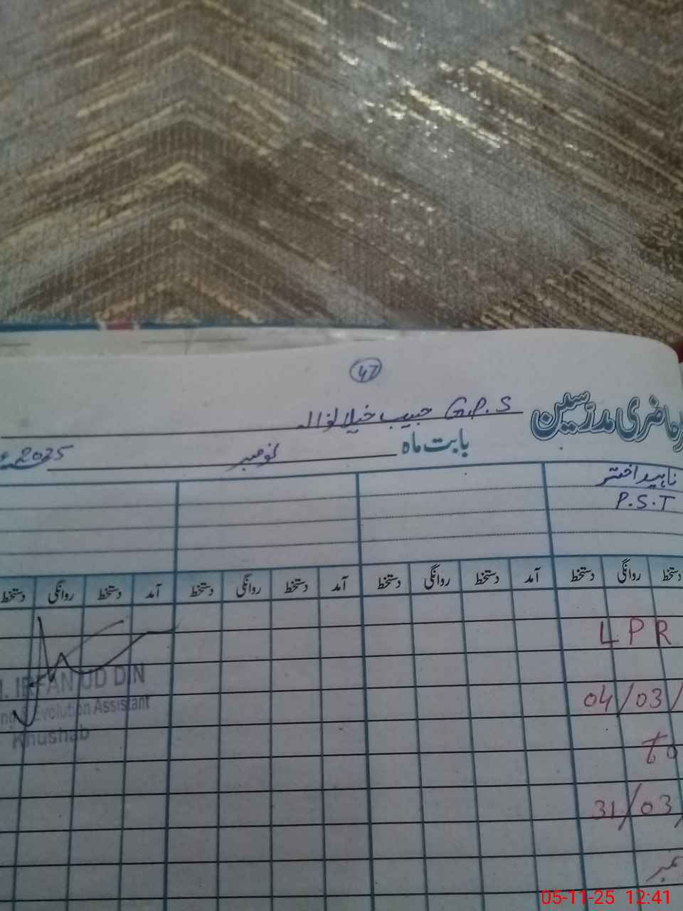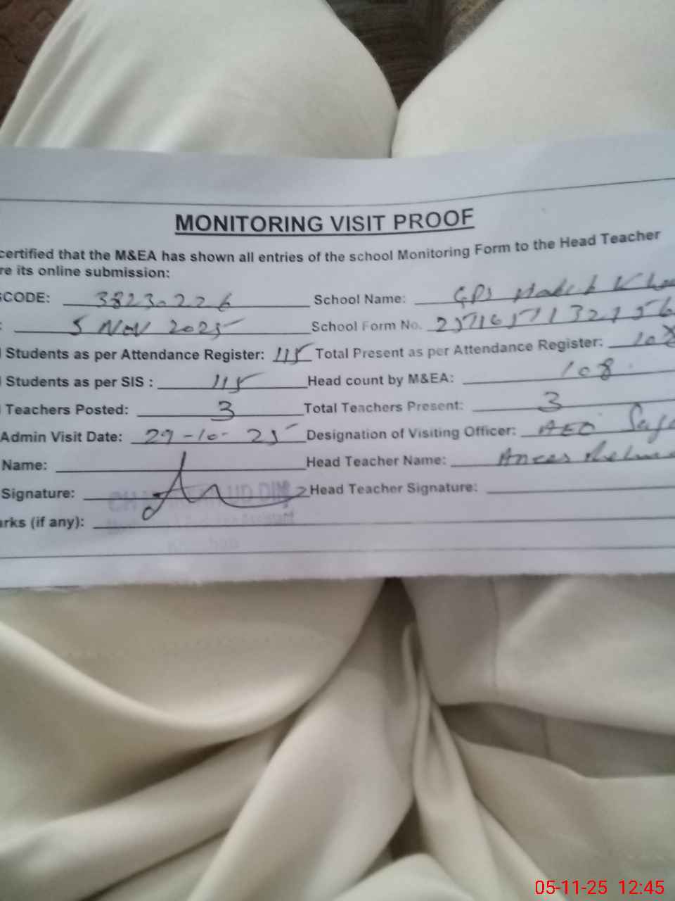 | Remarks (Use Separate Page if Required): Gps Habib khailan wala Student on sis 115 Student on register 115 Head count 108 Last visit aeo 29 Oct No teacher absent 4 rooms required Boundary wall needed 33 chairs for student needed | |||||
