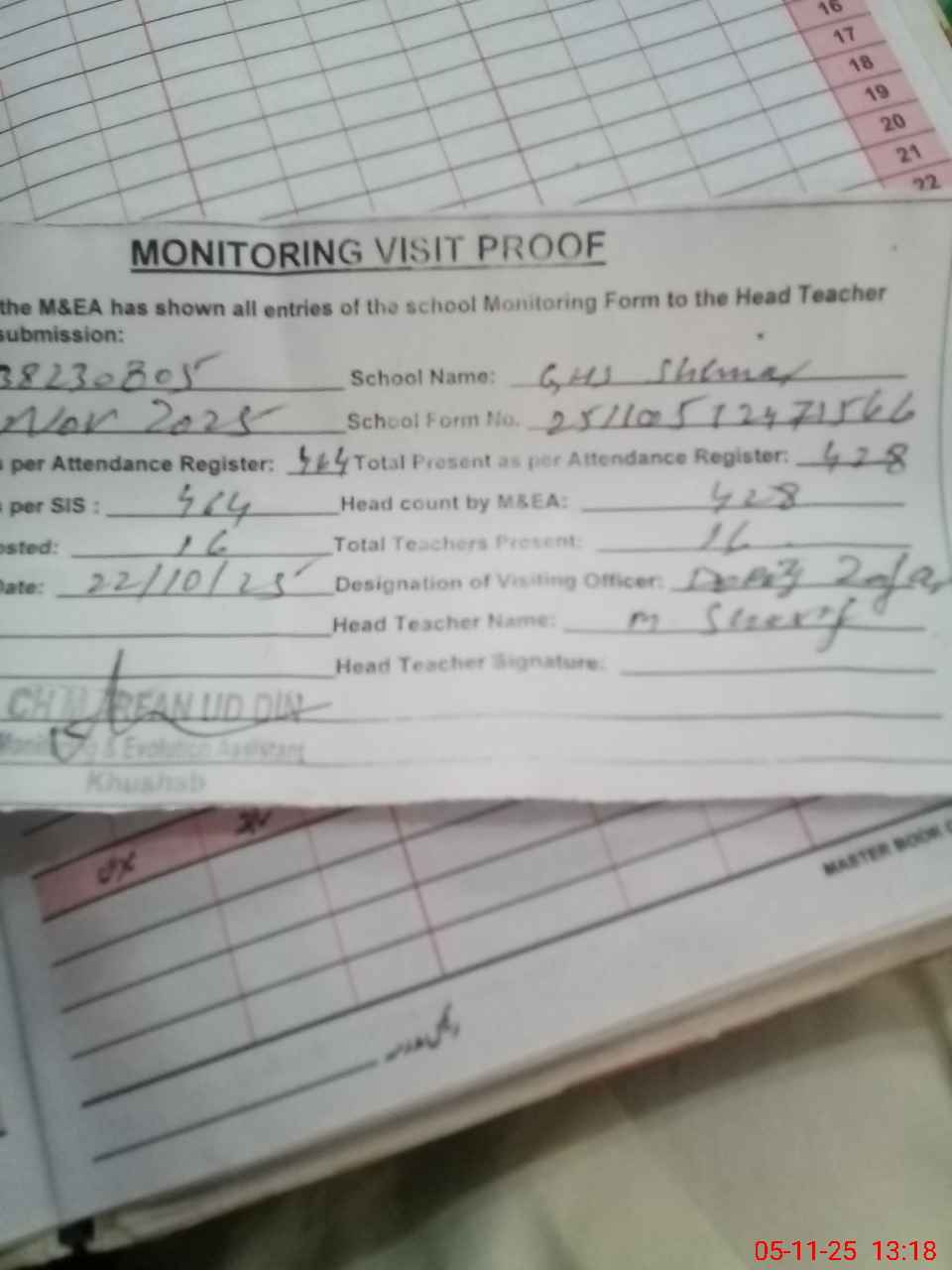 | Remarks (Use Separate Page if Required): Ghs shimar Student on sis 464 Student on register 464 Head count 428 Last visit deputy Zafar 22oct Missing facilities Science lab required Computer lab required 4 toilets required 120 student chair for students required 20 chair for teacher required | |||||