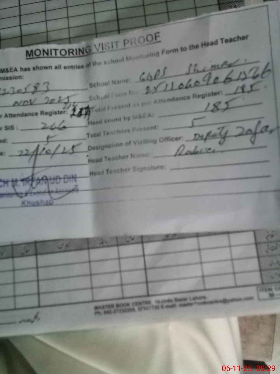 | Remarks (Use Separate Page if Required): Gps shimar Student on sis 265 Student on register 214 Head count 185 Last visit deputy 22 Oct No teacher absent Missing facilities Class rooms required Water issue exists As school is after noon teachers required | |||||