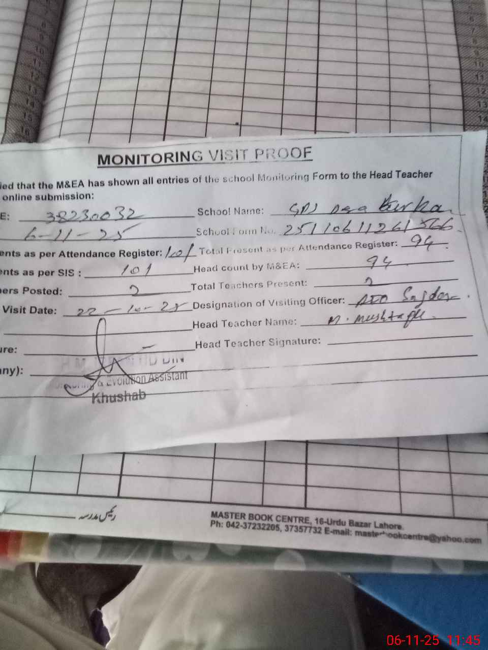 | Attendance Register | Head Teacher | MEA with School | Visit Proof |