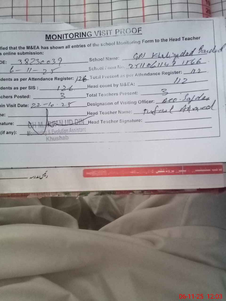| Remarks (Use Separate Page if Required): Gps khaliqdad bandial Student on sis 126 Student on register 126 Head count 112 Last visit aeo 22 Oct Class rooms needed Teaching staff needed | |||||