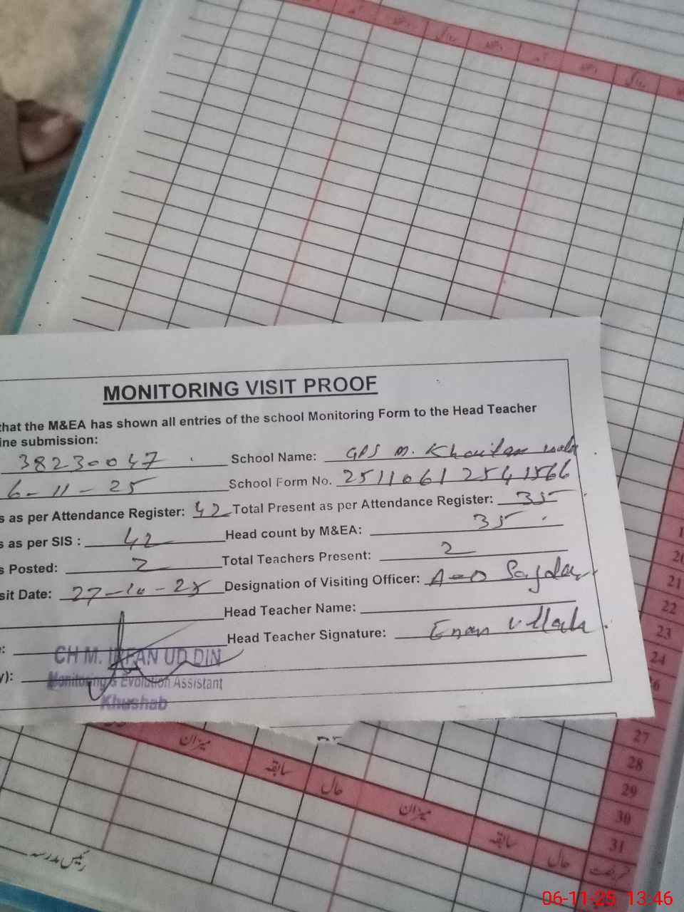 | Attendance Register | Head Teacher | MEA with School | Visit Proof |