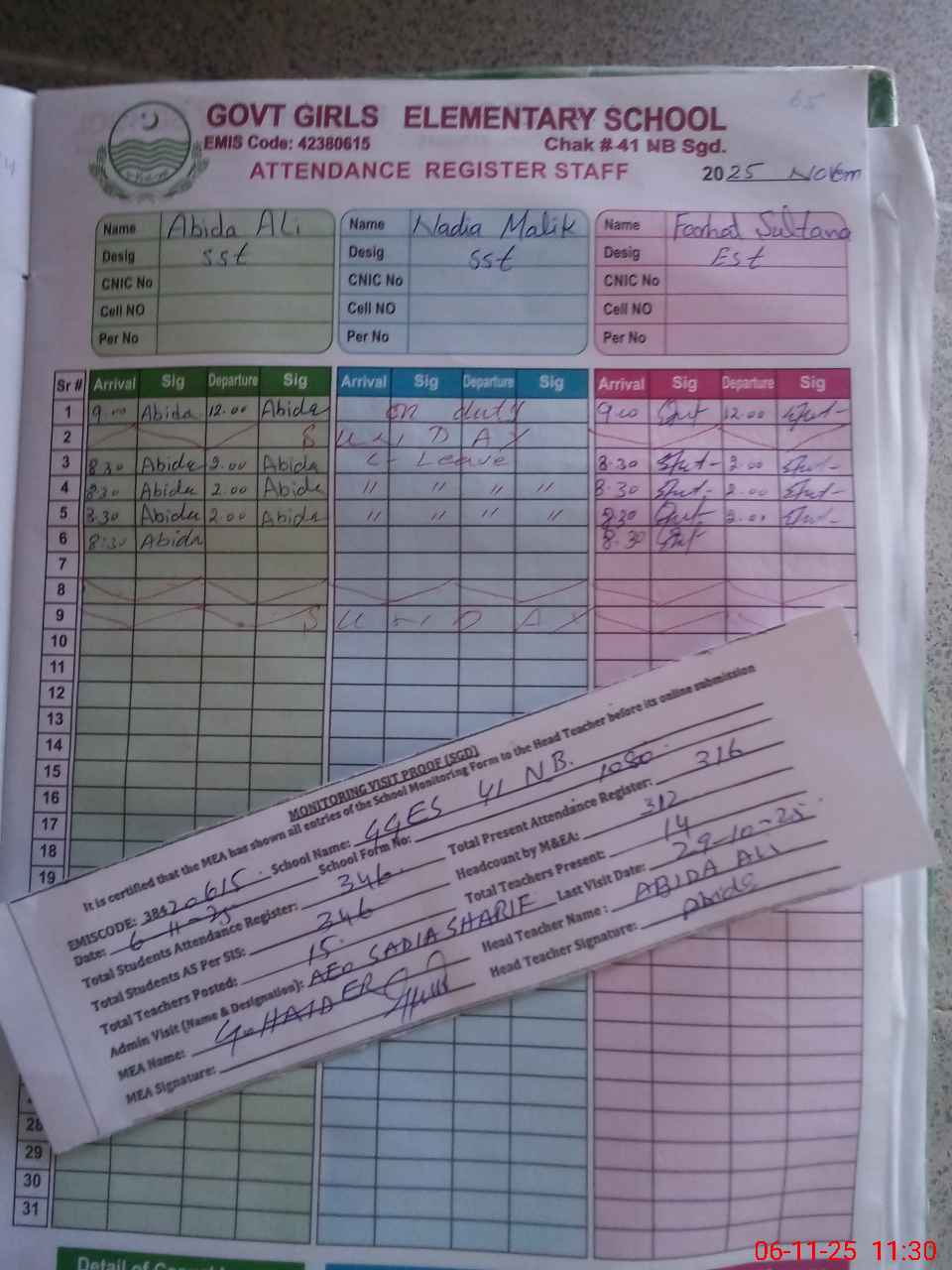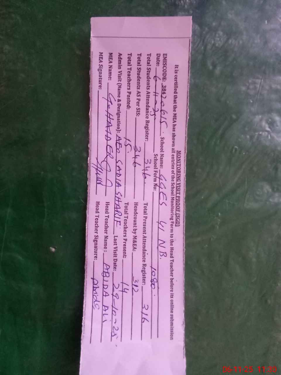 | Attendance Register | Head Teacher | MEA with School | Visit Proof |