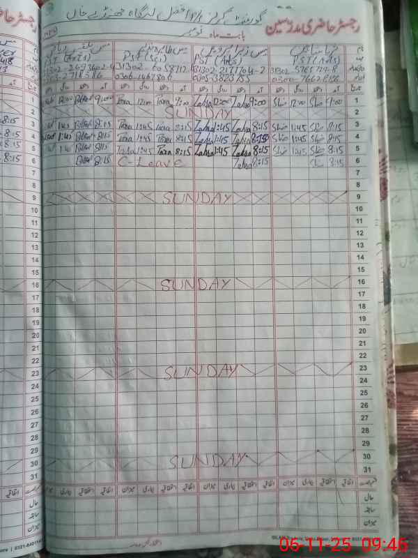 | CNIC | Full Name | Designation | R/C | Absence During Last Calender Month |