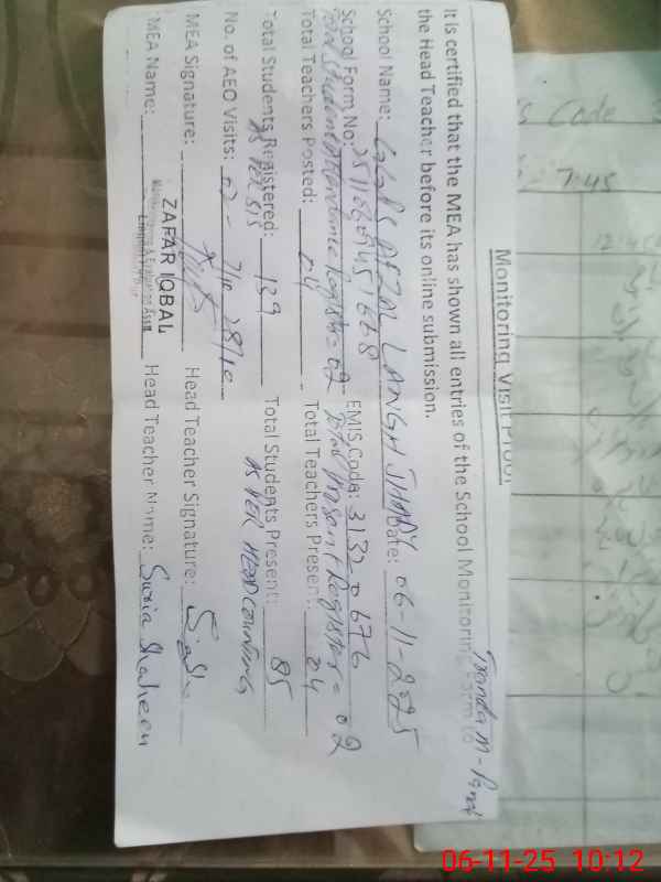 | EMIS Code: 31320676 | Name of School: GGPS AFZAL LANGA JHADY | |||