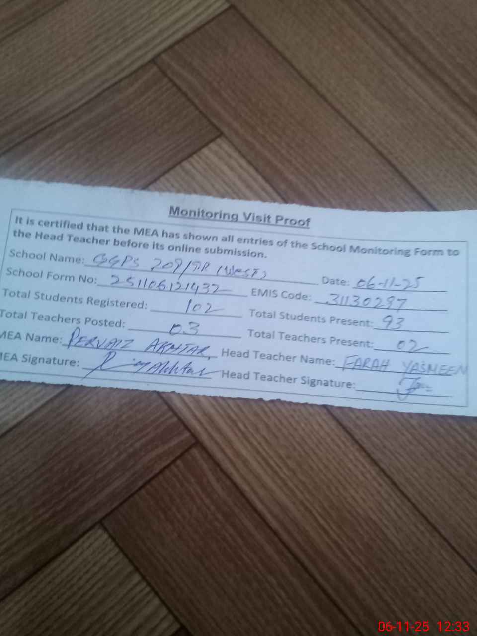 | Attendance Register | Head Teacher | MEA with School | Visit Proof |
