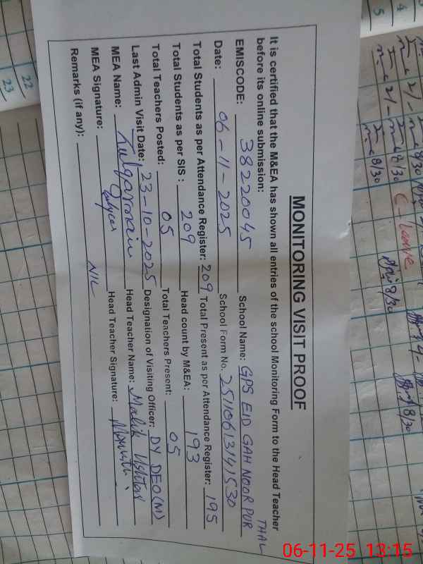 | EMIS Code: 38220045 | Name of School: GPS EID GAH NOOR PUR | |||