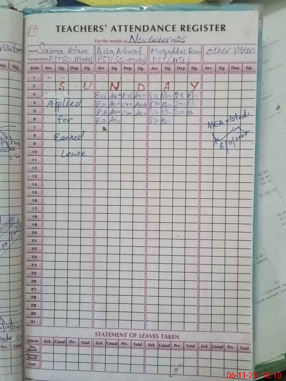 | Remarks (Use Separate Page if Required): As per attendance register PST Saima Aslam proceeded on earned leave wef 16 September 2025 but not approved as per next for Head teacher statement PST Saima Aslam proceeded UK for studying NSB register uncompleted | |||||