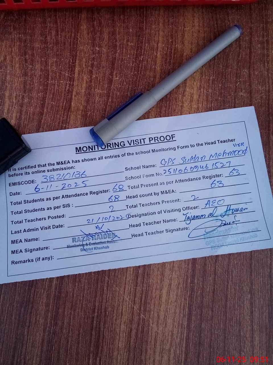 | Attendance Register | Head Teacher | MEA with School | Visit Proof |
