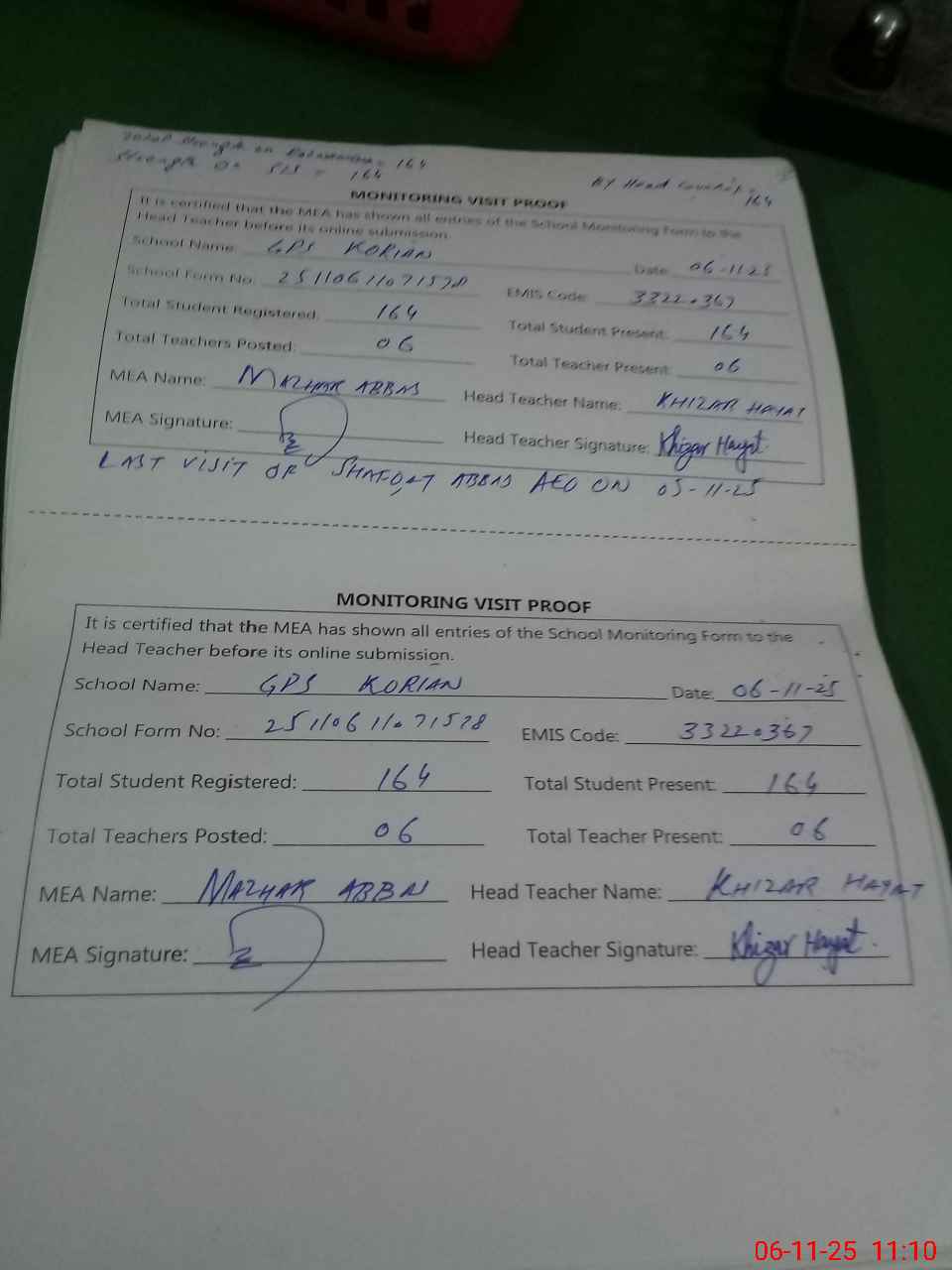 | Attendance Register | Head Teacher | MEA with School | Visit Proof |