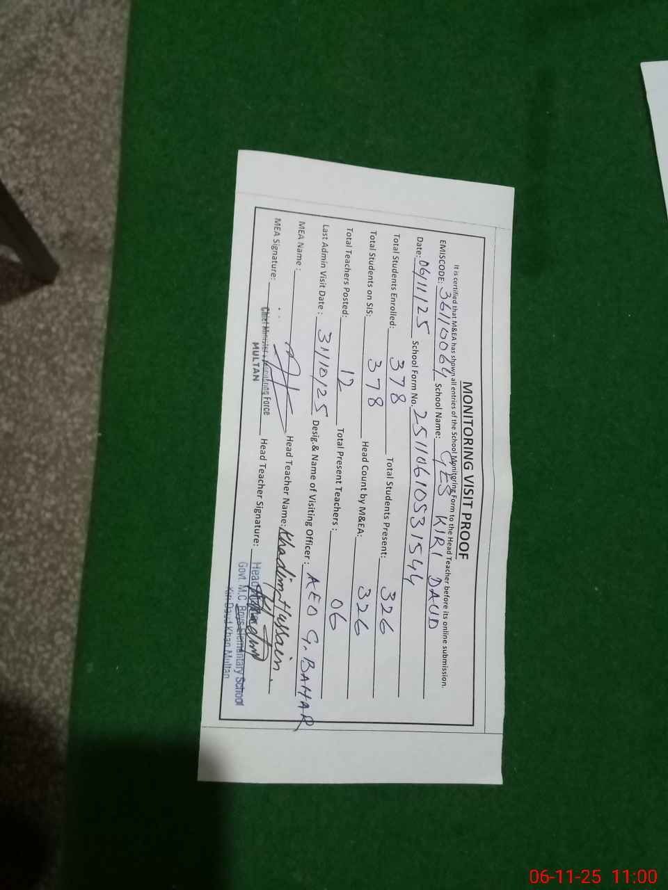 | Attendance Register | Head Teacher | MEA with School | Visit Proof |