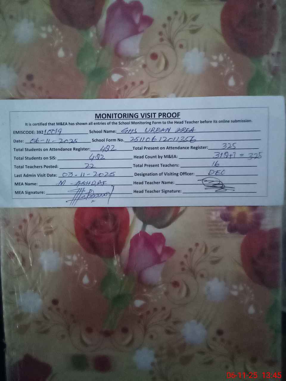 | Attendance Register | Head Teacher | MEA with School | Visit Proof |