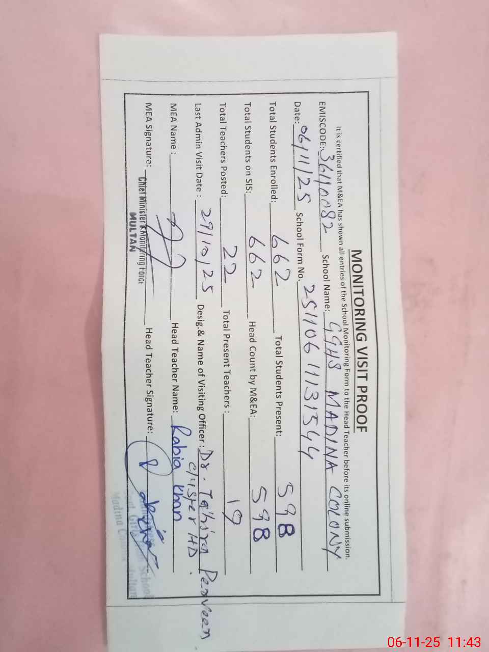 | Certified that this School was Inspected by the Undersigned MEA/DMO Today and the Information Stated Above is as Per Record. | |||||