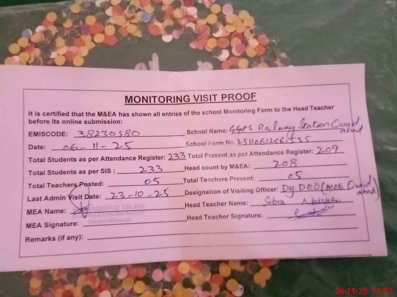 | Remarks (Use Separate Page if Required): Dy DEO visited school on 23 October 2025 Students strength on sis 233 | |||||