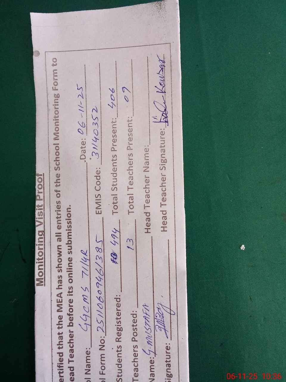 | Attendance Register | Head Teacher | MEA with School | Visit Proof |