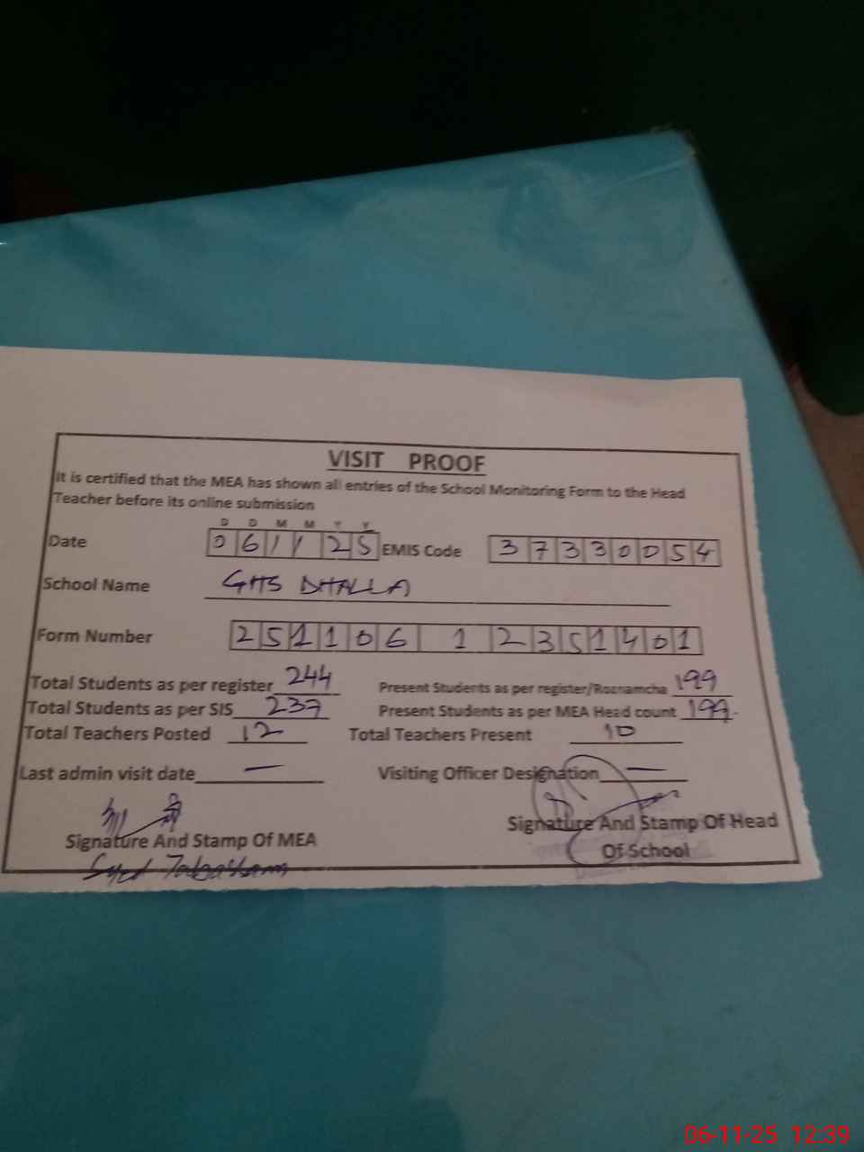 | Attendance Register | Head Teacher | MEA with School | Visit Proof |