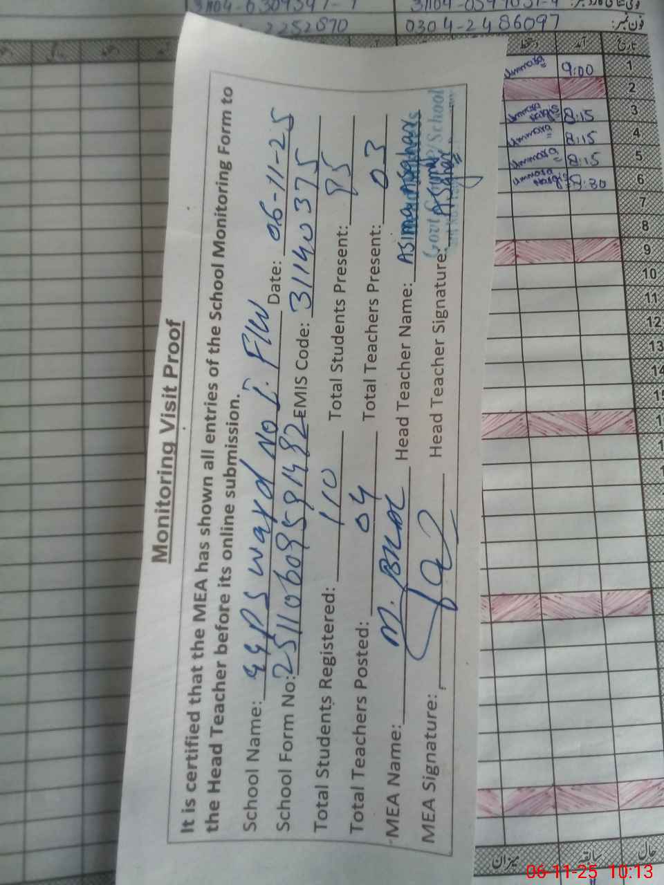 | Attendance Register | Head Teacher | MEA with School | Visit Proof |